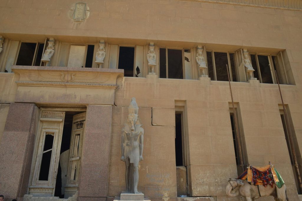 We continued to a more modern building, roughly square and surrounded by a low stone wall. It incorporated some elements of ancient Egyptian design, but was clearly out of use. Graffiti was scrawled across the walls, and the door had been kicked in. A handful of Egyptian teenagers stood outside, smoking, but left when we approached. We looked around the building. Peered inside at a replica of an Ancient Egyptian hunting scene painted on the back wall. Nader explained to us that it was a rest house, built by King Farouq, the penultimate king of Egypt, so that he had somewhere to stay when he brought dignitaries to see the pyramids. Previous monarchs had used the Mena House, but by then it had turned into a hotel, and Farouq wanted something more private. For a time, it had been used as a police station, but was then abandoned and left to decay.
