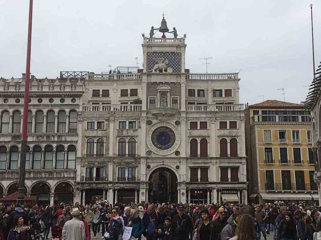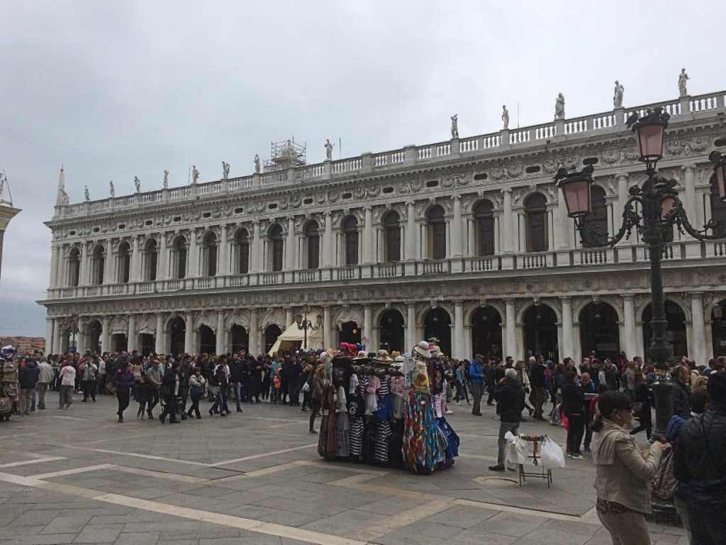 The big St Mark’s Basilica, stands at the corner of the square, in all its glory, with its many domes and intricate statued roofline. It usually sports a huge long queue snaking from its entrance across one part of the square.