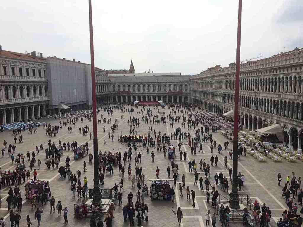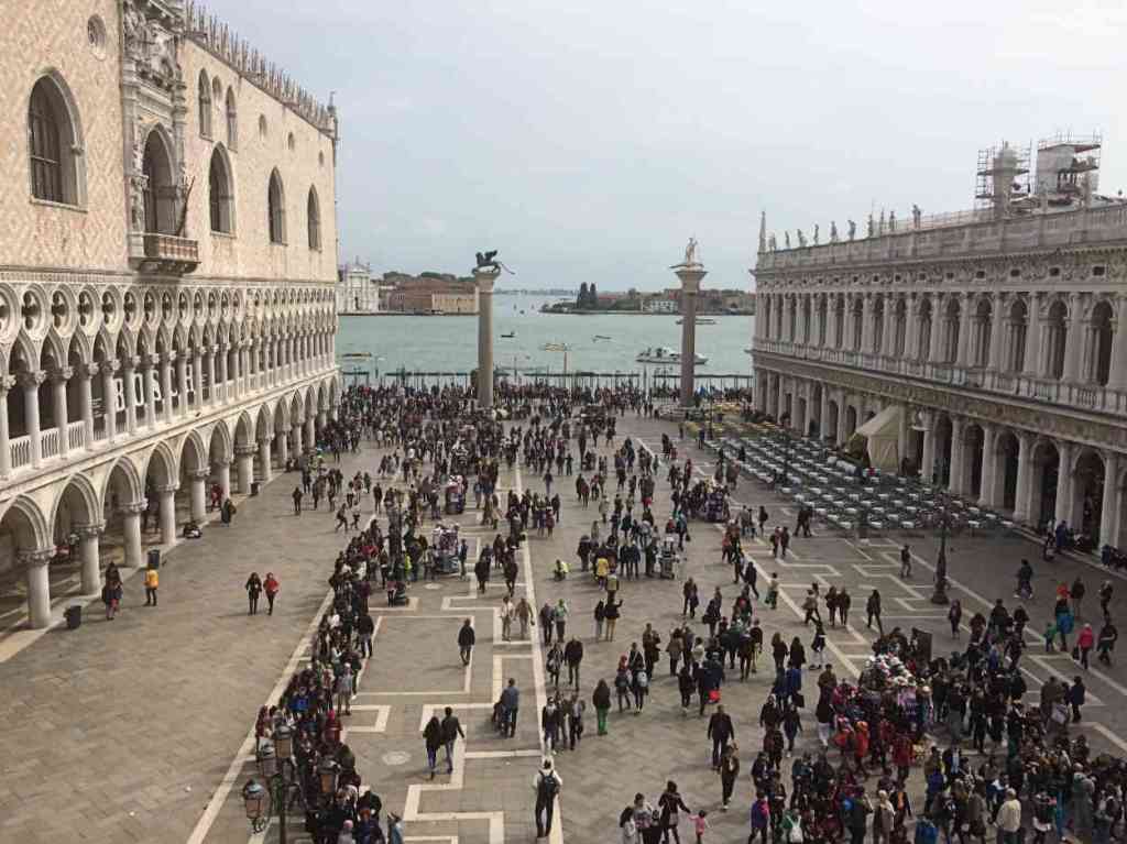 On one side are the views down one side of the square towards the water edge and the view of the Island of San Giorgio Maggiore overlooking the entrance/landing quay of St Mark’s Square.
