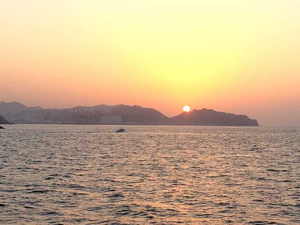 You get to gaze at the sun setting behind the backdrop of mountains on Muscat’s perimeter. No sundowners in Dubai as the resort faces the wrong way!